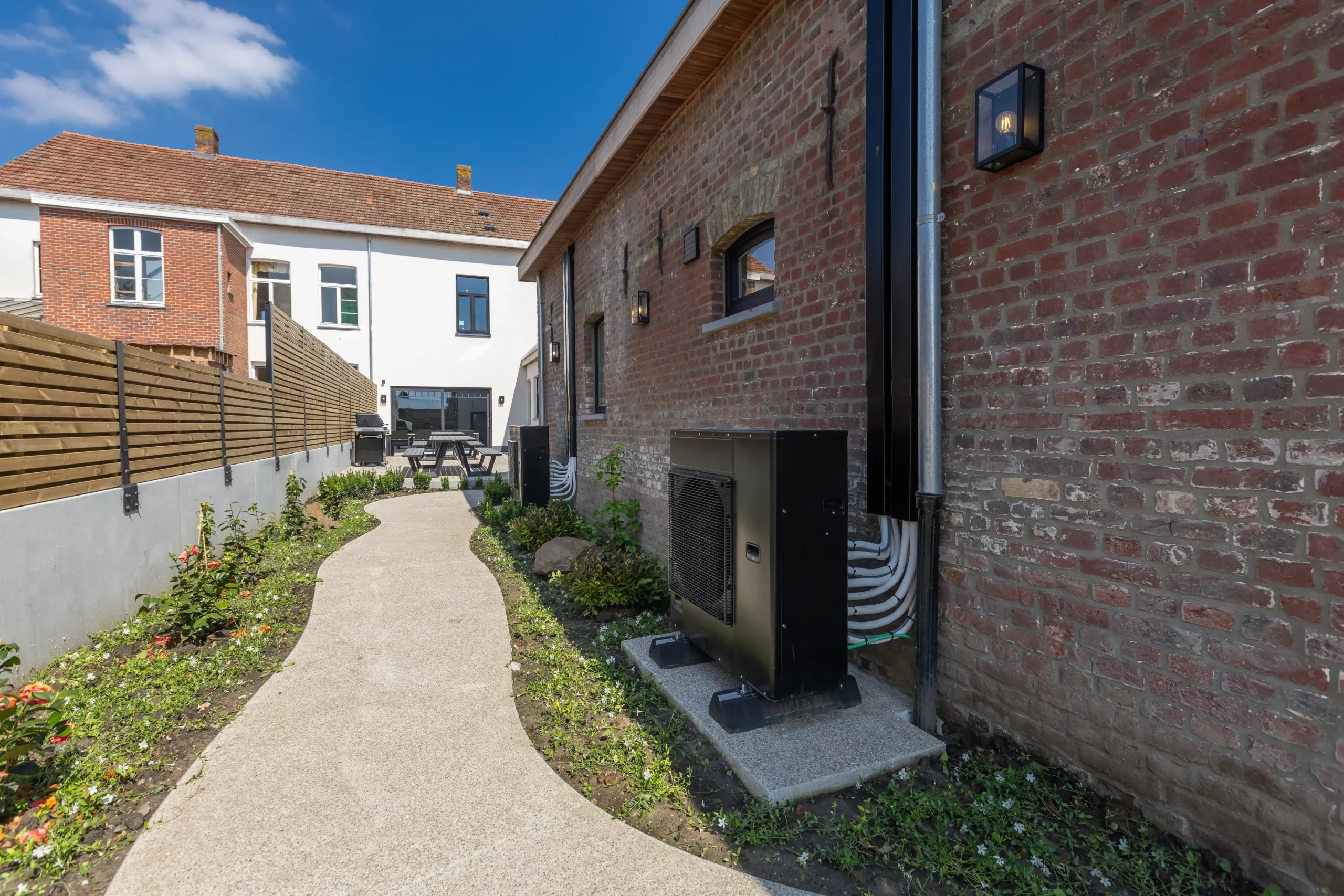• De groene, verzorgde tuin met stijlvol tuinmeubilair, BBQ en veilige moto- of fietsenstalling in een afgesloten garage, ideaal om buiten te genieten en de omgeving per fiets te verkennen.  In de garage vind je ook een wasmachine en een droogkast.