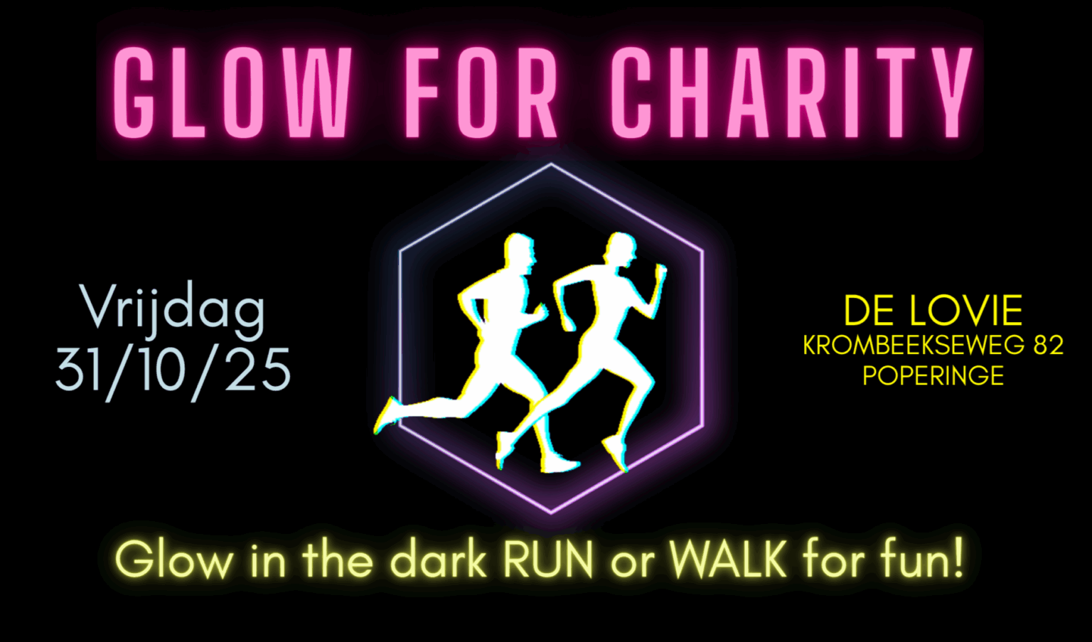 Glow for charity is een glow in the darkrun voor het goede doel BuSO De Pinker – Spalier in Poperinge. We voorzien 2 afstanden, 4 km en 8 km, en een kidstoer van 1,5 km. Het wordt een unieke glow-loopervaring in het donker! Mensen die liever al wandelend genieten van het mooie parcours, zijn zeker ook welkom! Doe mee & steun het goede doel!