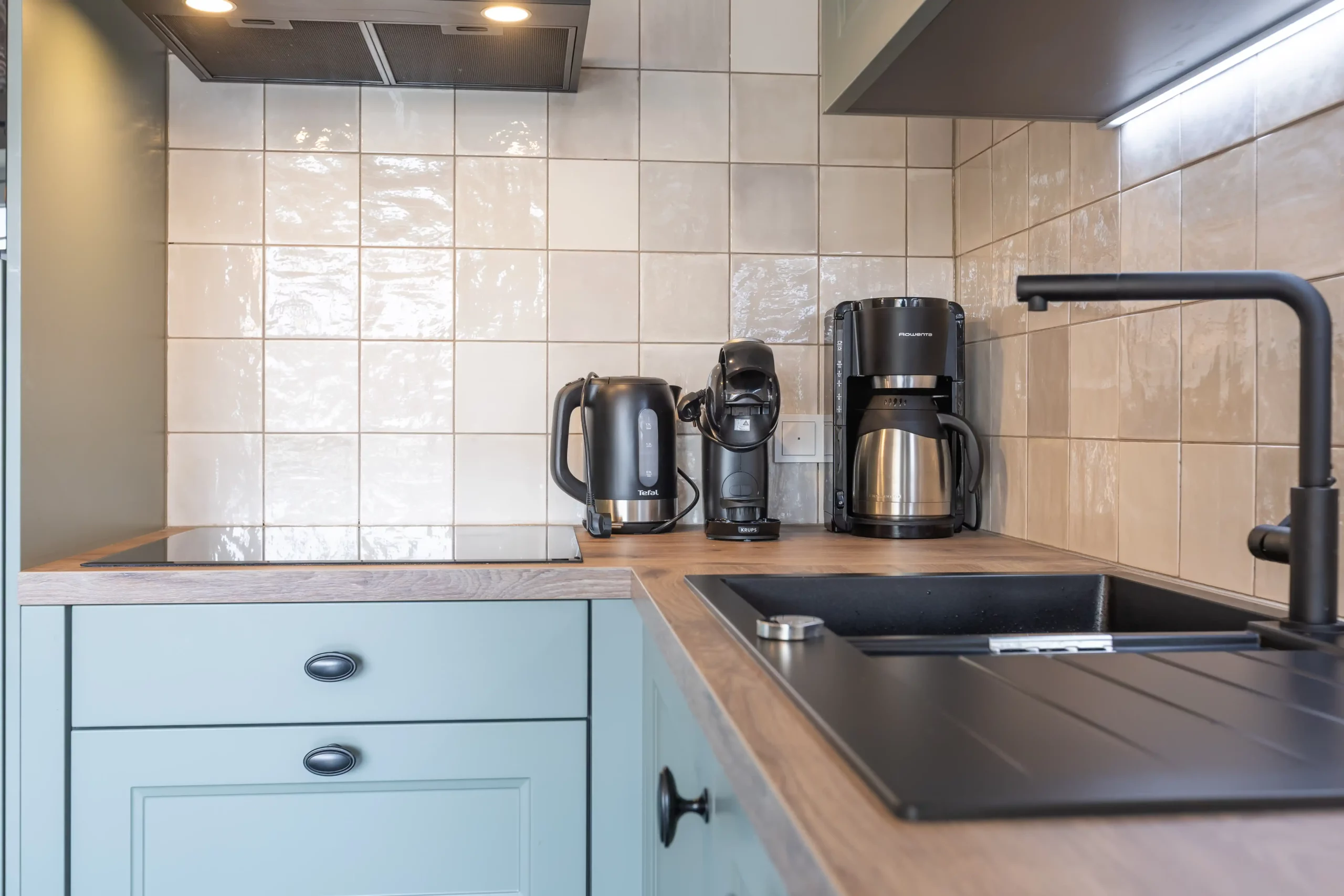 De badkamers zijn modern en stijlvol ingericht, met twee elegante pompbakken, een ruime inloopdouche en kwaliteitsafwerking. Alles straalt luxe en netheid uit, zodat je je dag in alle rust kunt beginnen of afsluiten. Elk huisje beschikt ook over een apart toilet.